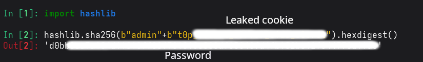 print(hashlib.sha256(b"admin"+cookie).hexdigest())